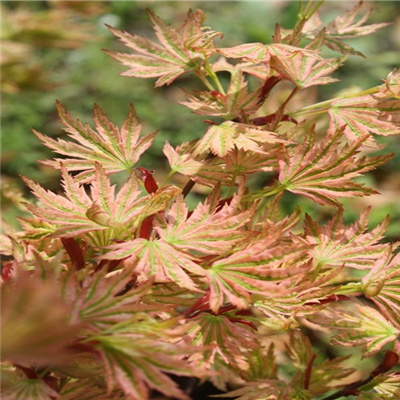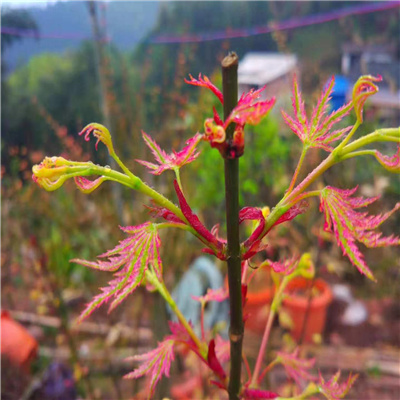 品种名: 枫树 日笠山 春季叶色:粉红色带黄绿色条纹 夏季叶色:黄绿色斑叶 秋季叶色:橙黄至橙红色 叶形分类: 小叶型 成年树高:成年树高约3-4米。 推荐理由:新芽很有特色,向上卷起,形状似招财手 用途:盆栽 庭院景观树 品种特性:小叶型,叶片密集, 春季色彩多变,斑叶,新芽卷起, 有红色芽鳞,形状似招财手又似 鹰爪;嫩叶观赏期约50天,秋季变色效果佳,长势旺,抗性好,树形直立, 养护要求:喜阳,稍耐阴,通风 透气环境,需要两个小时以上直射光照;秋季变色需0°低温。土 壤PH5.1-7.8,排水性要好,浇水充足;当年移栽小苗盛夏避开暴晒,地栽两年后可不遮阳,冬季-10°以下低温需防护。